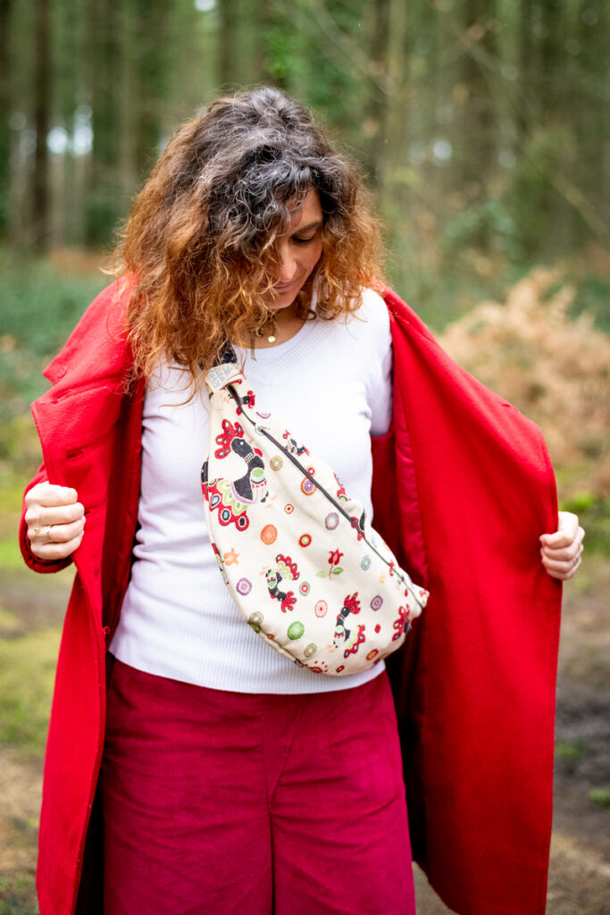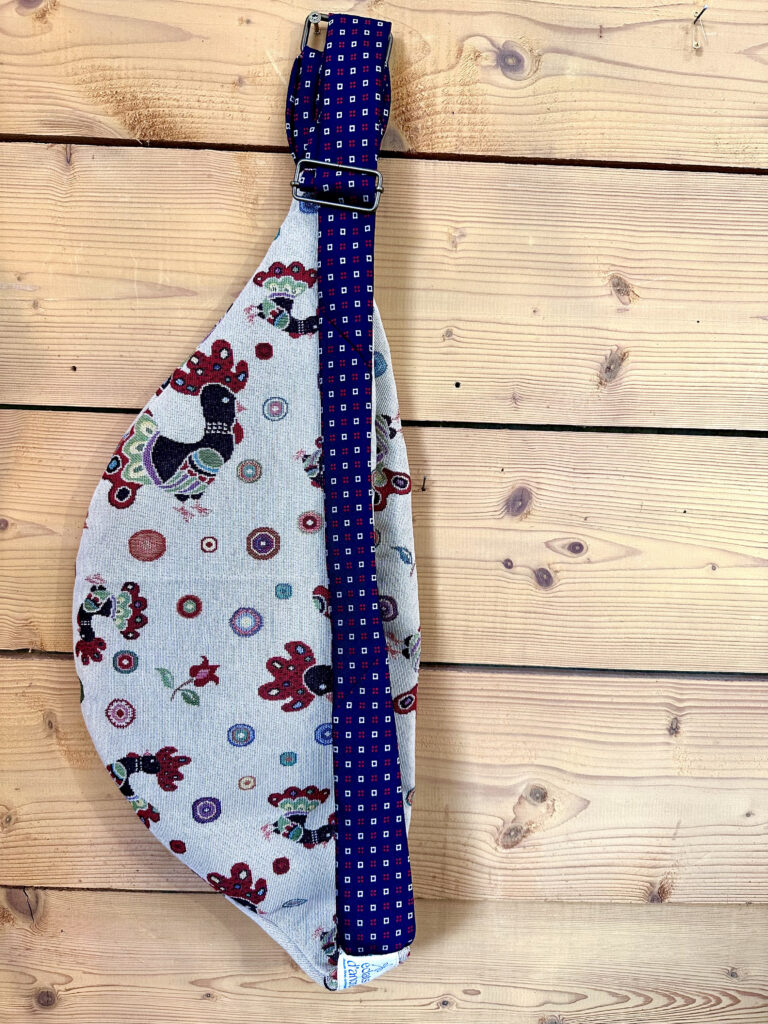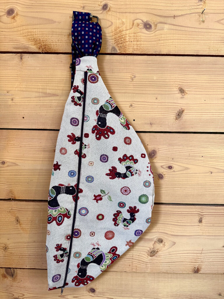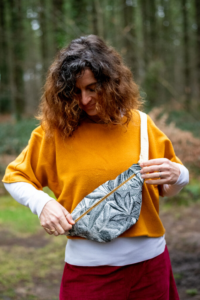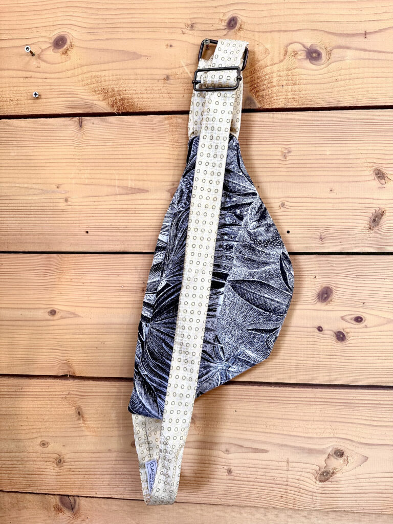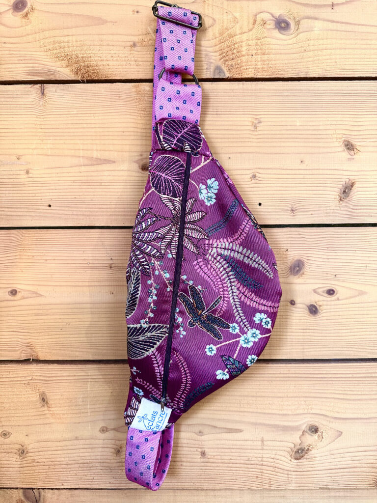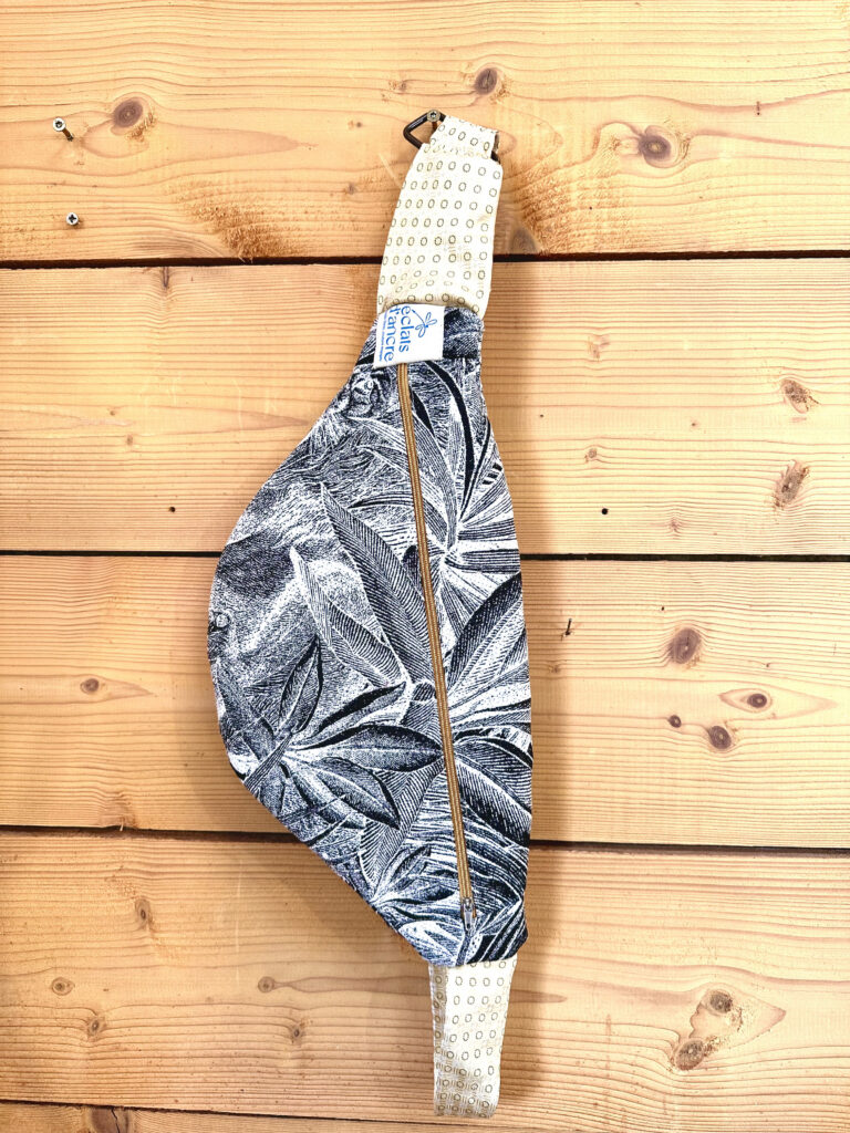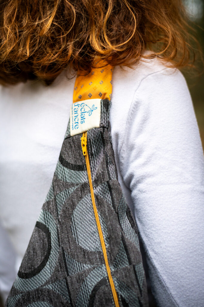 La banane Éclats d’Ancre est confectionnée à partir de chutes de tissus d’ameublement, choisis pour leur tenue et leur caractère. Chaque pièce est unique, fabriquée en Bretagne à partir de matières existantes et recyclées.